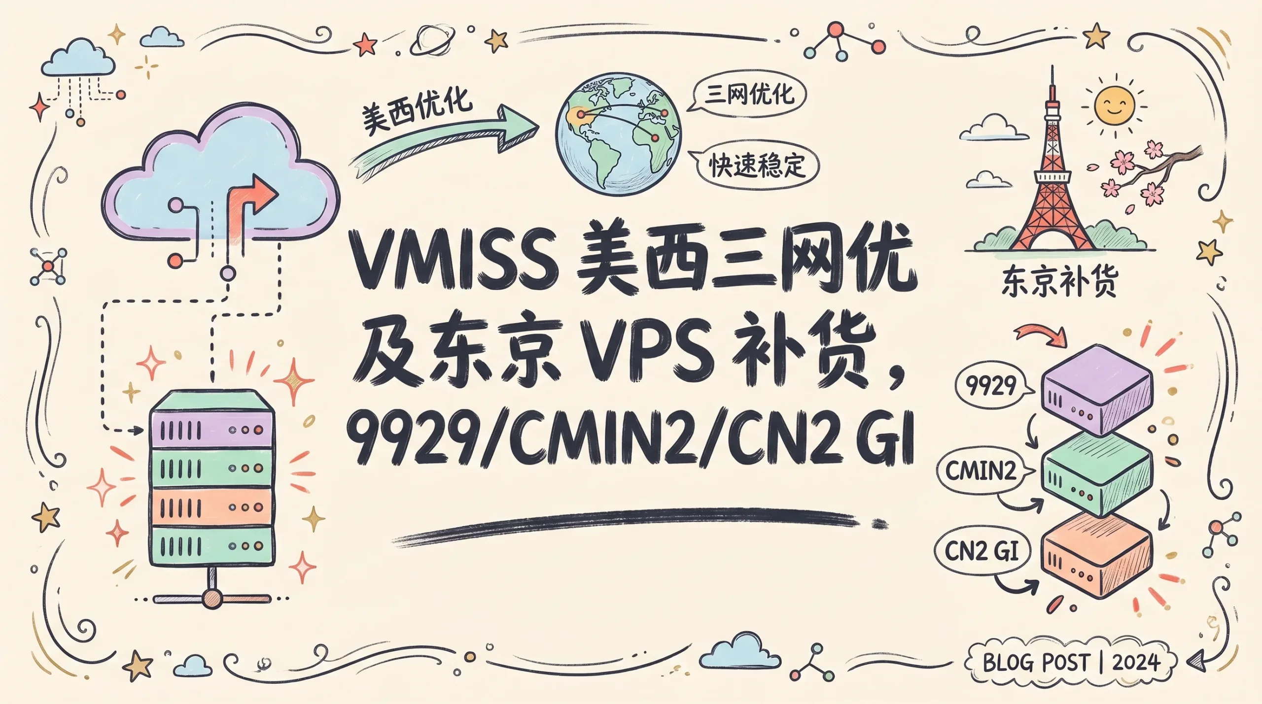 VMISS 刚刚补库存,美西洛杉矶和日本东京多个机房套餐重新上架,这次补货的线路挺全,美国洛杉矶有 9929、CMIN2、CN2 GIA 三条三网优化线路,日本东京有 BGP 和 IIJ 两条线路,配置都是 1 核 1G 起步,月付原价 5~6 加元,用优惠码 10%OFF 全场打 9 折后最低 4.5 加元/月,折合人民币大概 23 块钱。带宽方面美国洛杉矶 200Mbps,日本东京给 500Mbps,流量 300G 到 500G 不等,用来建站、跑代理或者日常折腾都能应付。